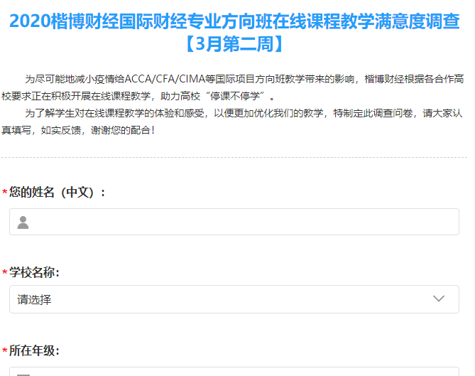 根据9428cn太阳集团古天乐与楷博财经合作办学的教学安排,提前三周就调研国际项目学生的在线学习条件。早在2月8号,因亚洲地区3月份的全球统考取消,学院与楷博财经双方就有意开展在线教学,联合对国际项目学生进行了问卷调查,了解疫情期间学生对线上课程学习的需求和建议。调查问卷结果显示,98%以上的学生具备上网学习的条件;针对不具备上网学习条件的同学,学院及楷博财经积极协助最终解决困难,使ACCA/CIMA国际项目班全体学生100%达到在线学习条件。同时,针对问卷结果,为在问卷调查中表示缺乏口罩等防护物资的同学给予及时援助。