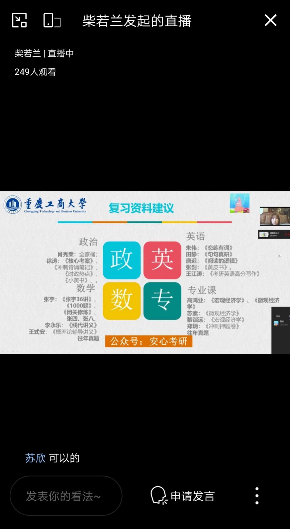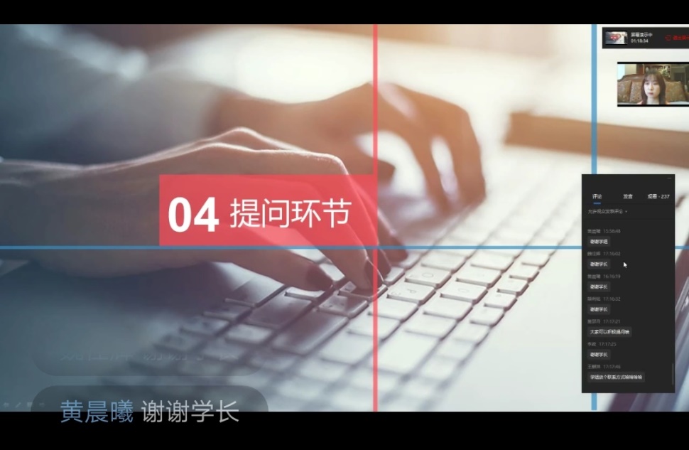 最后,活动进入自由提问环节。虽是线上分享交流,同学们的热情好学之心丝毫不受影响。怀揣着考研梦的学子们带着自己心中的疑问向学长学姐们请教,四位学长学姐则一一对同学们的提问作出解答,并提供了相应有效的解决方案,让学弟学妹们获益匪浅。