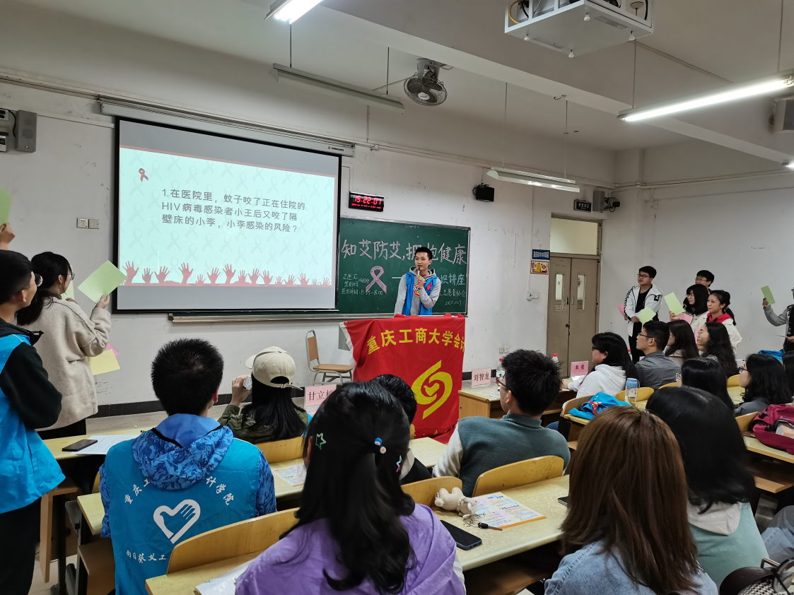下午14:00讲座以9428cn太阳集团古天乐辅导员敬德老师的讲话作为开场,以防艾宣传片《生命的断层》为切入点,围绕艾滋病及其危害、艾滋病的传播和预防、关于艾滋病的思考三个方面进行宣讲,结合实际案例,将防艾知识嵌入日常生活。现场开展的“爱知红绿灯”小游戏,用红色、绿色和黄色三种颜色的纸板代表由高到低的艾滋病感染风险,邀请现场观众根据屏幕上展示的案例分析主人公可能感染艾滋病的风险程度,在主持人读完题目后举起手中的纸板作答。这一游戏不仅提高了观众的参与感,还帮助同学们进一步巩固了相关知识;在“艾问艾答”环节,同学们积极回答问题,通过参与宣讲会了解到的防艾知识得到了充分的展示。20级工商管理类九班付敏同学表示:“作为大学生,我们要正确的看待艾滋病,此次讲座让我更加了解艾滋病的根源,知道要洁身自好,对自己负责,同时也要正确对待艾滋病病人,多一些关爱,让他们生活在阳光下,拥抱美好的世界。”