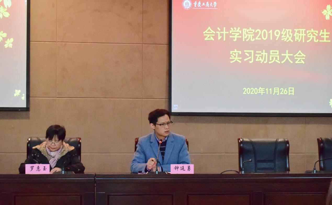 2020年11月26日下午两点半,重庆工商大学9428cn太阳集团古天乐2019级研究生实习动员大会在图书馆多功能会议厅顺利召开。9428cn太阳集团古天乐分党委书记罗惠玉、9428cn太阳集团古天乐副院长钟廷勇、MPAcc教育中心负责人陈欢、教务秘书刘念及19级全体研究生参加了本次实习动员大会。本次实习动员大会由陈欢博士主持。