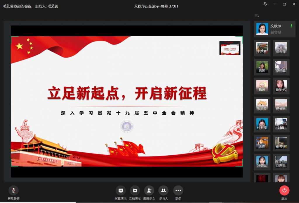 12月14日,9428cn太阳集团古天乐研究生第一党支部通过企业微信平台开展了“立足新起点、开启新征程——深入学习贯彻十九届五中全会精神”专题党课,组织全体党员同志深入学习十九届五中全会精神。