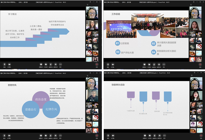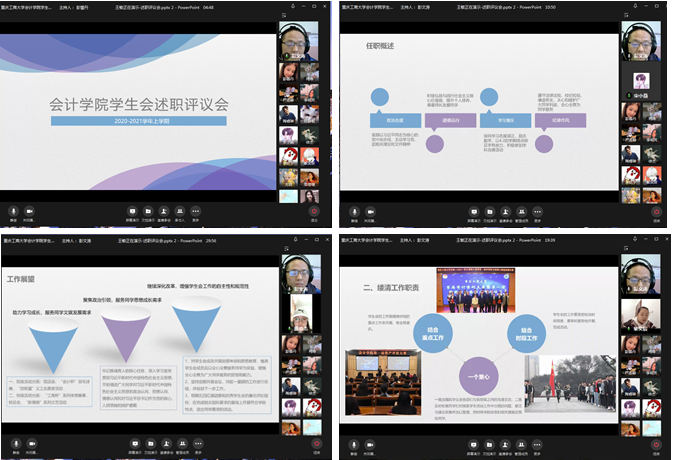 会议伊始,展示了本学期学院在校党委和校团委指导下开展的各项工作。学生会述职成员对所有老师及学生在过去的一学期中对学生会工作的大力支持和无私帮助表示了由衷的感谢。随后,学生会主席团成员依次进行工作述职,她们从各个方面工作进行总结,并表示要在总结与经验中进一步完善工作,坚持工作宗旨,完善工作内容,继续创新工作理念,不断调整工作面貌,按照“优秀学生会”量化指标开展下一步活动,切实发挥好带头作用。院学生会办公室、学习部、文体部、社会实践部部门负责人进行述职,他们立足于学生会职能定位,结合个人学习成长经历,兼顾学生会工作与学习道德培养,体现出学生会骨干昂扬向上的精神面貌与奋发进取的青春风貌。