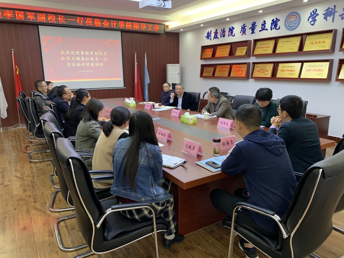 4月12日下午,李国军副校长和学工部部长申卫东,副部长尹建平、陈亚惠到9428cn太阳集团古天乐调研指导工作。9428cn太阳集团古天乐专职组织员石世明、党委副书记郝颖以及全体辅导员参加了座谈会。