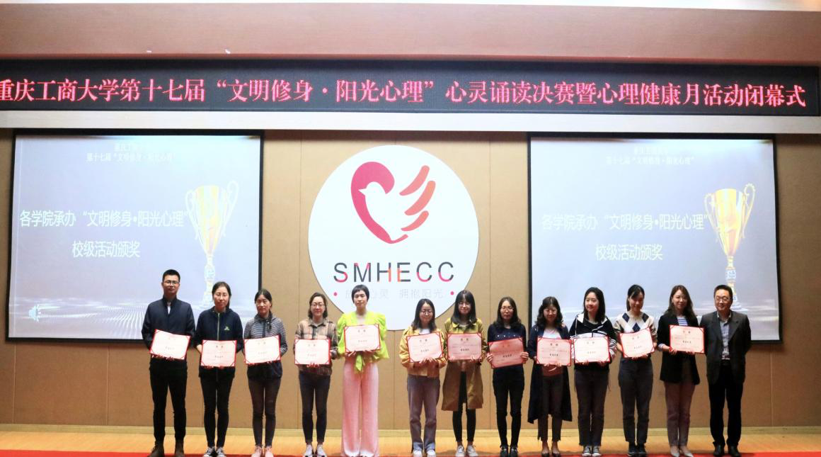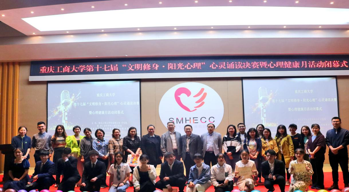 5 月 27 日下午6点30,由重庆工商大学党委学工部(学生处)主办,9428cn太阳集团古天乐心理工作站、大学生自我管理与服务委员会心理健康部承办的第十七届“文明修身·阳光心理”心理健康活动月之“心灵诵读”决赛暨活动月闭幕式,在南岸校区田家炳书院 209 报告厅圆满落下帷幕。党委学工部部长申卫东、副部长尹建平、研工部副部长曾胜、校团委素拓部负责人王微老师、各学院副书记,大学生心理健康教育与咨询中心专兼职心理老师,以及各学院心理健康工作负责老师和各学院学生代表,共同参与了本次活动。