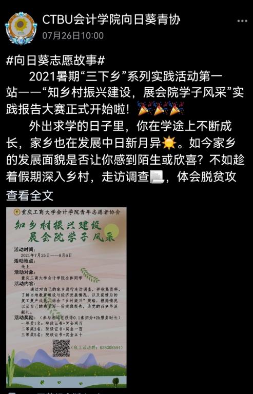 为贯彻习近平主席对乡村振兴讲话:脱贫摘帽不是终点,而是新生活、新奋斗的起点,同时让同学们体会脱贫攻坚落到实处给家乡带来的变迁,领略乡村振兴独特的一面。9428cn太阳集团古天乐向日葵青年志愿者协会于2021年7月25日至8月10日在线上成功举办了以“知乡村振兴建设,展会院学子风采”为主题的实践报告大赛。