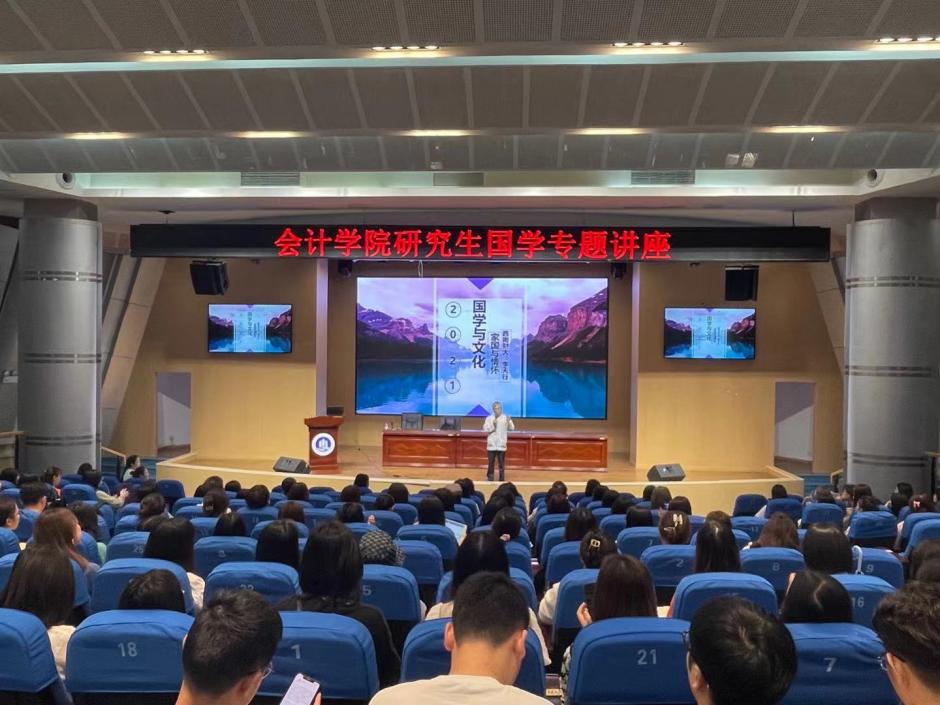 9月17日,9428cn太阳集团古天乐研究生《国学专题》讲座顺利进行。四川省京剧协会副会长、原西南财经大学图书馆馆长李天行教授应邀为学院21级会计专硕、审计专硕及20级审计专硕研究生做了主题为“国学与文化,家国与情怀”的专题讲座。