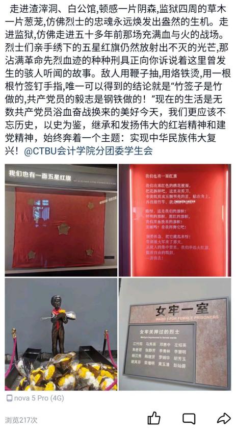 10月1日至5日,活动如期开展,活动前期各组织通过QQ空间、班级群、活动大观园等宣传方式积极宣传,取得了巨大反响,同学们参与热情高涨,积极参与本次活动,所参观的红色景点从北京天安门到重庆歌乐山烈士陵园包含全国各地,并将参观感悟与国庆祝福在QQ空间进行分享。除此之外,同学们也互相邀约参与共同此次活动。
