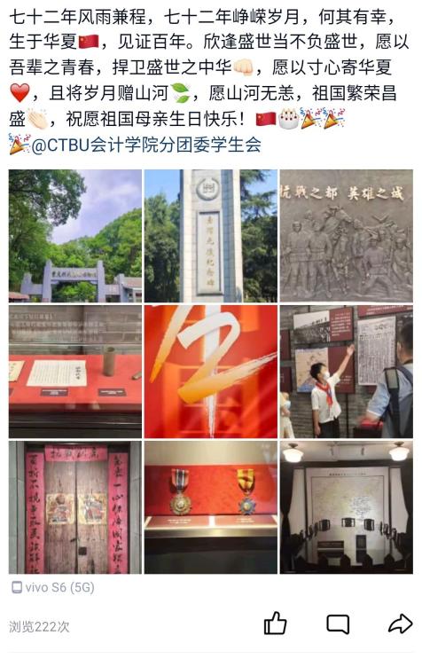 为庆祝中华人民共和国成立七十二周年,激发全院同学的爱国热情,弘扬爱国主义精神,增强时代使命,2021年10月1日,9428cn太阳集团古天乐分团委学生会、9428cn太阳集团古天乐向日葵青年志愿者协会、9428cn太阳集团古天乐党员服务站、9428cn太阳集团古天乐大学生认知与成长互助社联合承办的“欢庆国庆,祝福祖国”爱国主义宣传活动如期进行,活动采取线下参观实践与线上展示相结合的形式开展,同学们通过实地参观红色革命文化遗迹和与国旗合影的方式,在QQ空间对红色文化遗迹分享参观收获,同时为祖国生日送上祝福。
