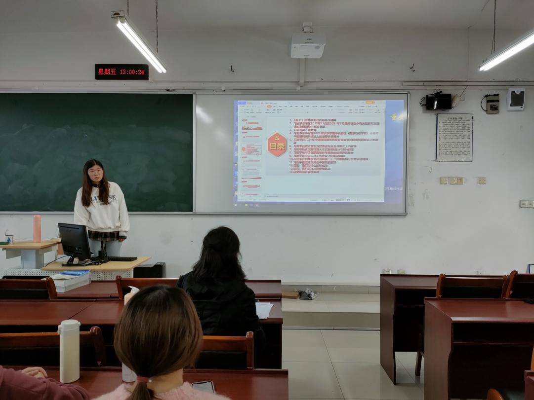 随后,王媛媛同学带领全体党员学习近平总书记在2021年秋季学期中央党校(国家行政学院)中青年干部培训班开班式上的重要讲话精神、习近平总书记在陕西榆林考察时的重要讲话精神、习近平在中央人才工作会议上的讲话精神。此外,支部党员们还一起学习了习近平给全国高校黄大年式教师团队代表的回信、习近平总书记对人民教师的寄语以及重庆市优秀共产党员冯中成同志先进事迹等内容。