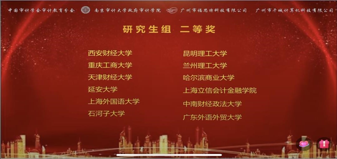 在各级领导大力支持、指导教师石恒贵、李晓羽和王杏芬等的悉心指导下,经过奋力拼搏,9428cn太阳集团古天乐2019级李昌平、谢媛、周莹组成的本科代表队和2021级审计专硕徐佳豪、周涵非、邓帆组成的研究生代表队,从300多支队伍中脱颖而出,双双斩获全国二等奖。