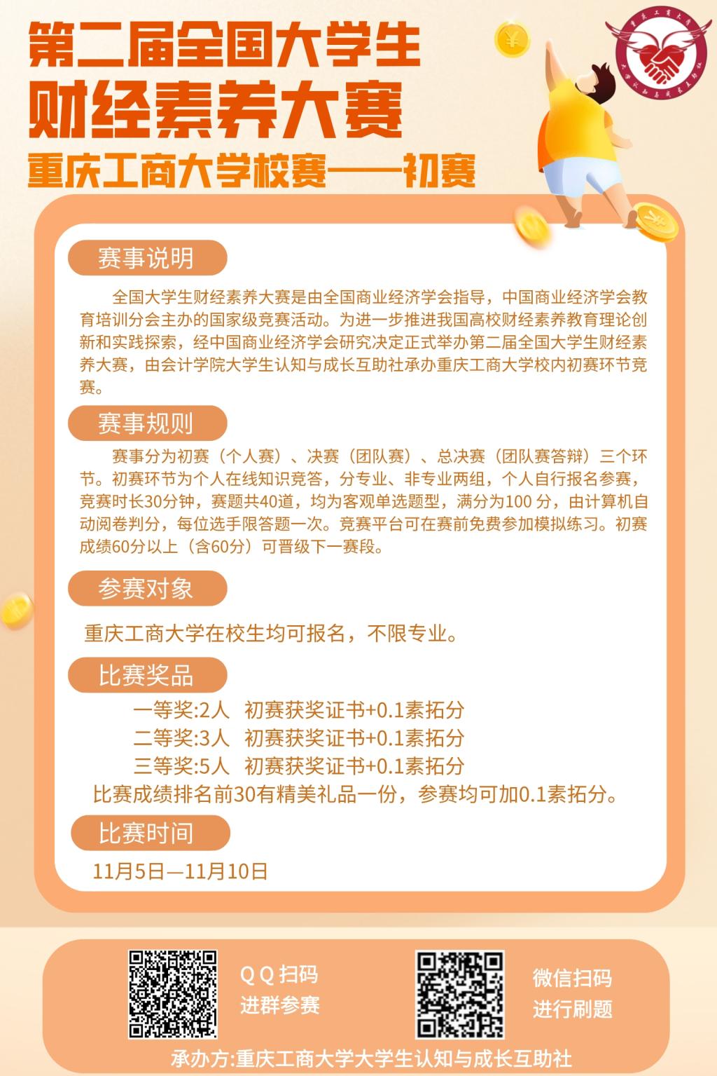 为进一步推进我校财经素养教育理论创新和实践探索,培育学生财经素养正确认知、处理与管理财经事务的能力,由重庆工商大学9428cn太阳集团古天乐主办,大学生认知与成长互助社、财会研究会携手承办的第二届全国大学生财经素养大赛初赛于本月20日圆满落幕。