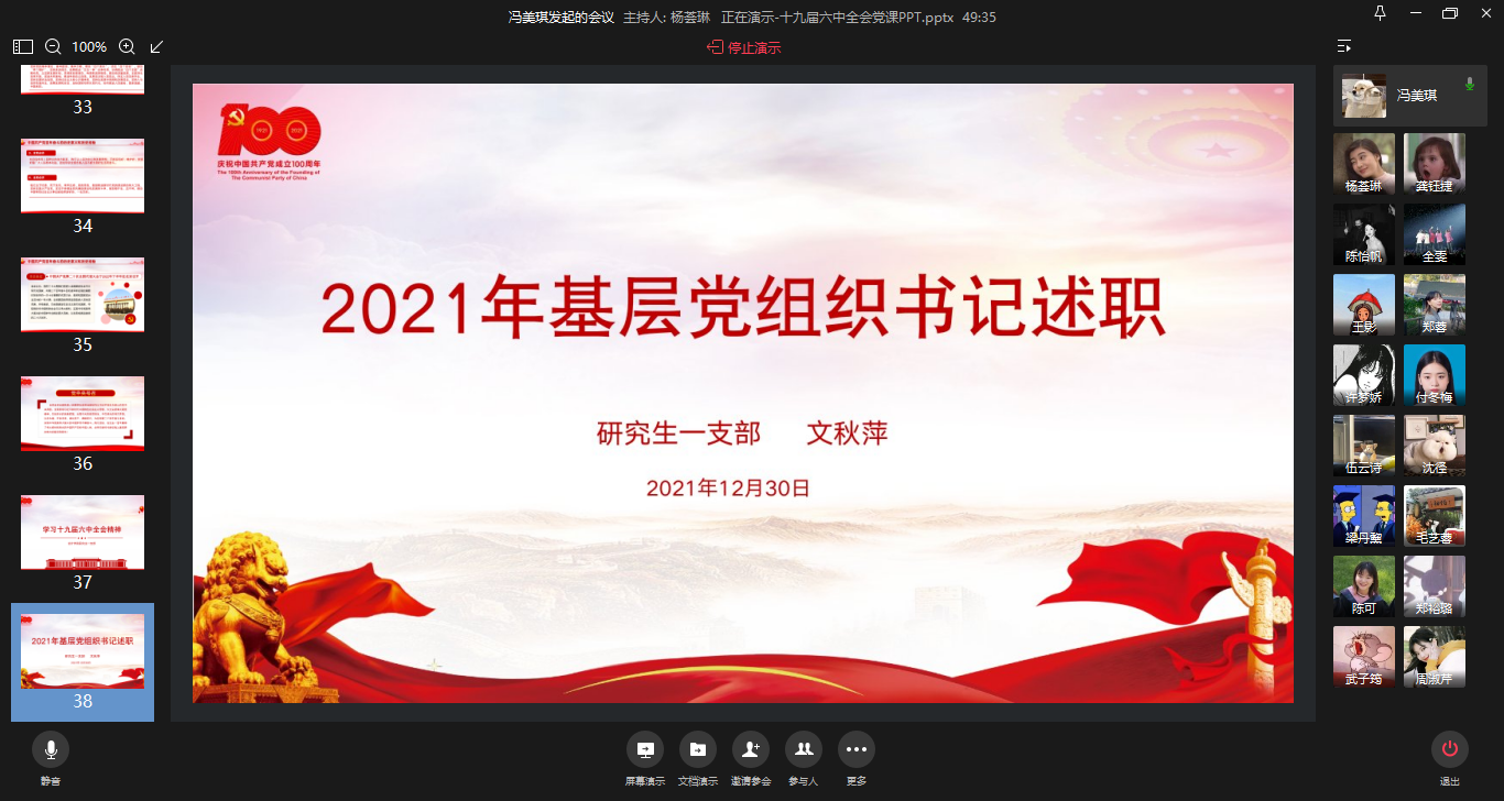 12月30日,9428cn太阳集团古天乐研究生第一党支部12月理论学习暨党支部书记述职评议大会在明德楼1015会议室举行,支部全体党员通过线上加线下的方式参加了此次会议。