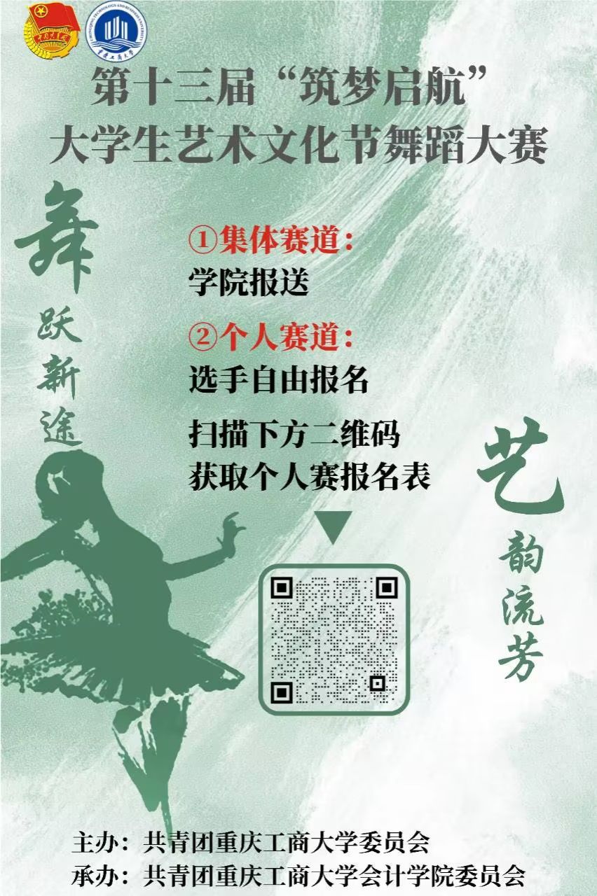 (1)报名方式:扫描海报二维码,填写报名信息,并将不低于1分钟的舞蹈片段视频压缩打包,以“个人+学院+参赛人姓名+舞蹈名称”命名(如:个人+9428cn太阳集团古天乐+张三+《党的生日》),于2025年3月31日晚上22:00前发送至邮箱:CTBUhuichen123@163.com;