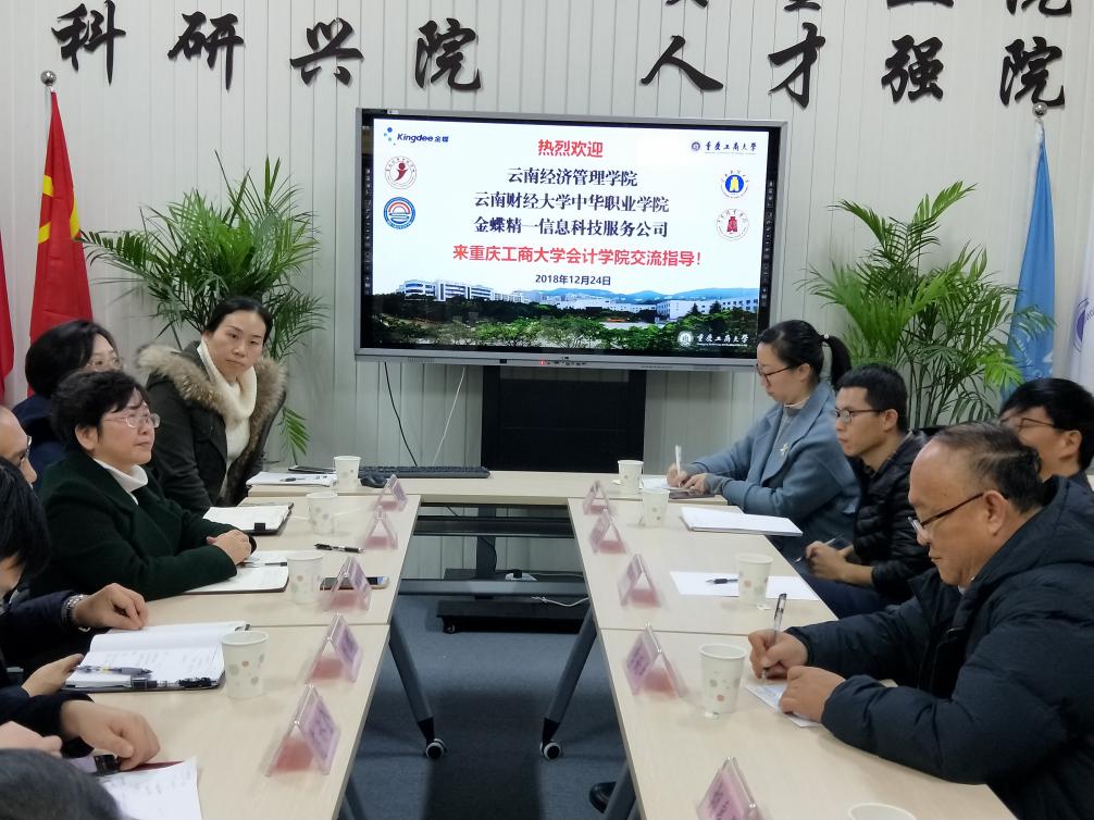 12月24日下午,云南财经大学中华职业学院院长李秋平、云南经济管理学院财会金融学院院长彭家生、金蝶软件西南区培训教育总监苏然等一行13人来我院调研交流。调研座谈会在明德楼2016会议室召开,座谈会由副院长黄辉主持,学院分党委书记罗惠玉、会计系副主任幸素园、财务管理系主任杜迎新、审计系副主任蒋水全和实验室主任石道元参加了此次会议。