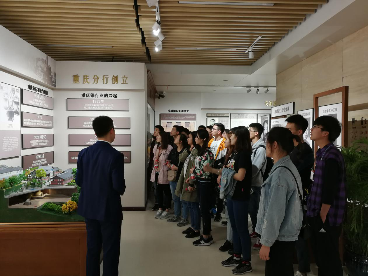 此次参观学习活动分两个部分,首先是参观交通银行重庆市分行行史馆。讲解员按照“历史线+专题区”的展陈逻辑,围绕交通银行110年及交通银行重庆市分行30年间相关史料的展陈内容,详细生动地向同学们介绍了交行的发展历程。