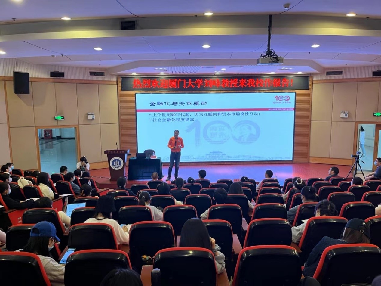 讲座伊始,刘峰教授通过与大家分享共享单车、共享充电宝、滴滴快车、短视频app、新能源车、茶饮料等社会常见现象,指出这些“网红产业”的根源是资本的支持,引出了资本的概念。随后,刘峰教授结合古典戏曲名著《西厢记》详细阐述了“金融化与资本驱动”和“金融化程度与波动性”的含义,解释“资本的性质是利益导向”、“资本引导优质资源配对”的观点。他认为,当今是以数字经济为重点发展方向的时代,同学们需要关注到互联网、物联网与资本市场的良性互动。社会经济发展的变化带来的不仅是时间、空间等方面的便利,更多的而是思维的进步。大家要意识到社会金融化程度的提高和其多个方面的体现,才能更清楚地认识到“金融化与资本驱动”的相关性。最后,刘教授跟大家分享了2022年需要重点关注的资本变化,他分析了“制造行业发展趋势下降”、“金融化程度与波动性正向相关”、“元宇宙与虚拟化”三方面的大环境发展趋势,强调时代变化之快和了解实时事的重要性,鼓励同学们将理论知识与实务界的行业、产业联系进行思考。他认为,在日新月异的新时代中,我们需要从定义和再生产过程两方面出发,重新认识资本。希望以此启发同学们的论文写作思路。
