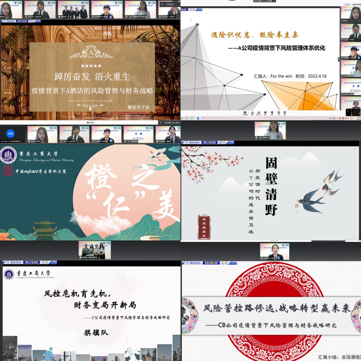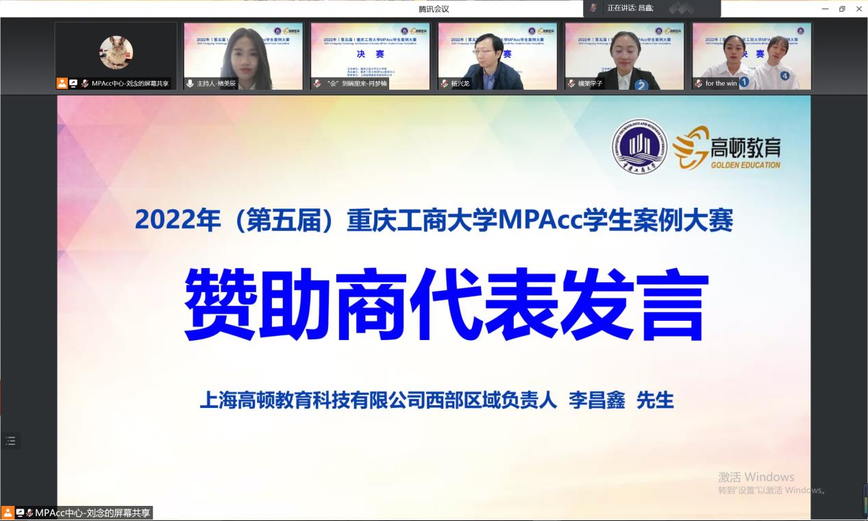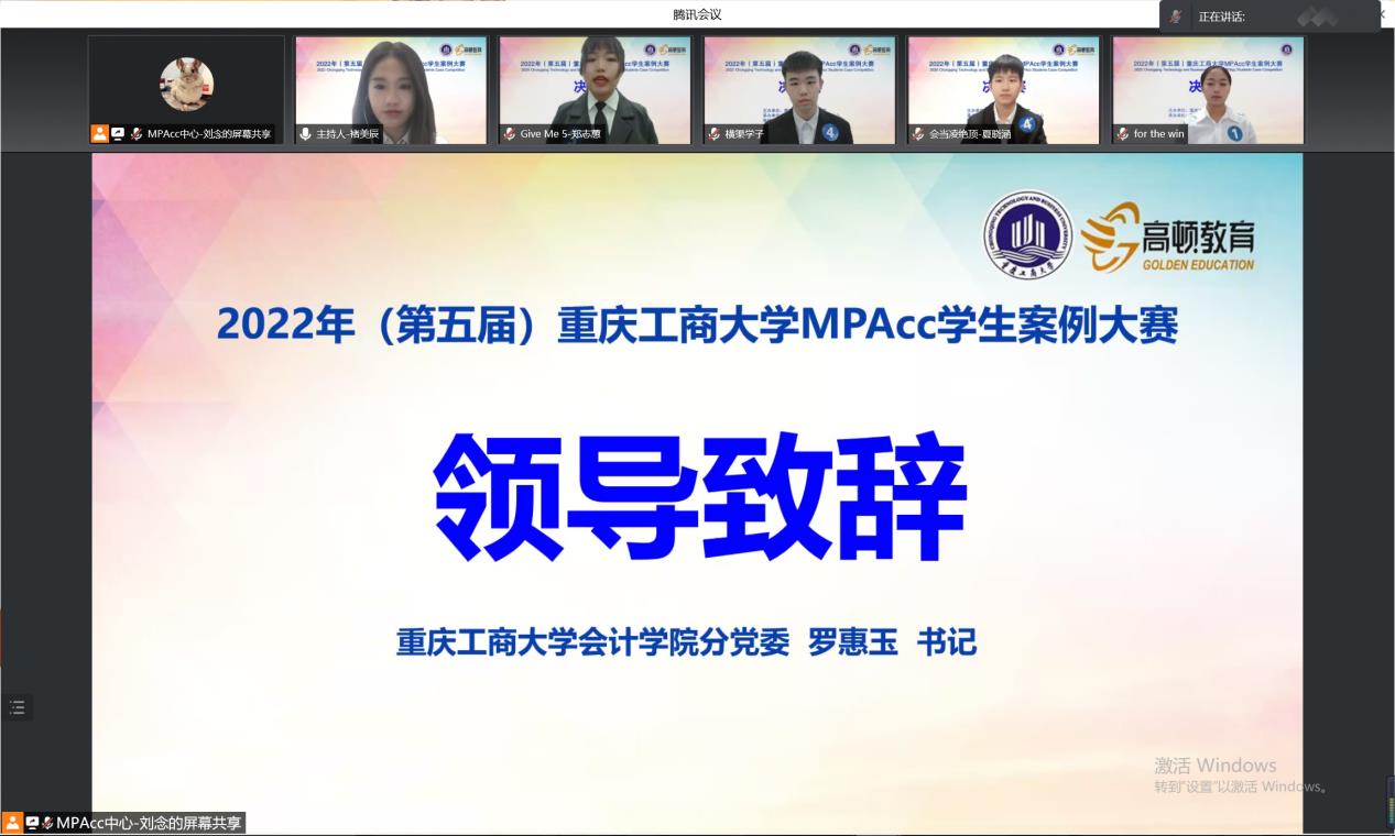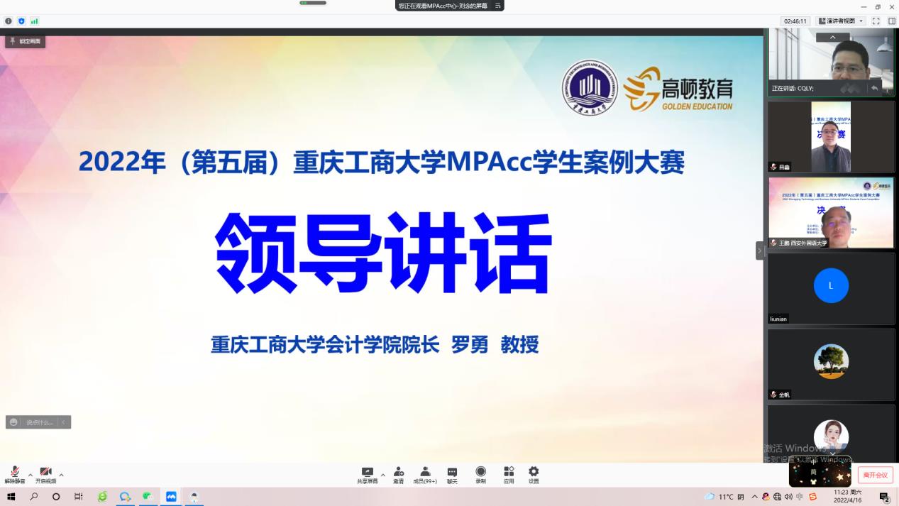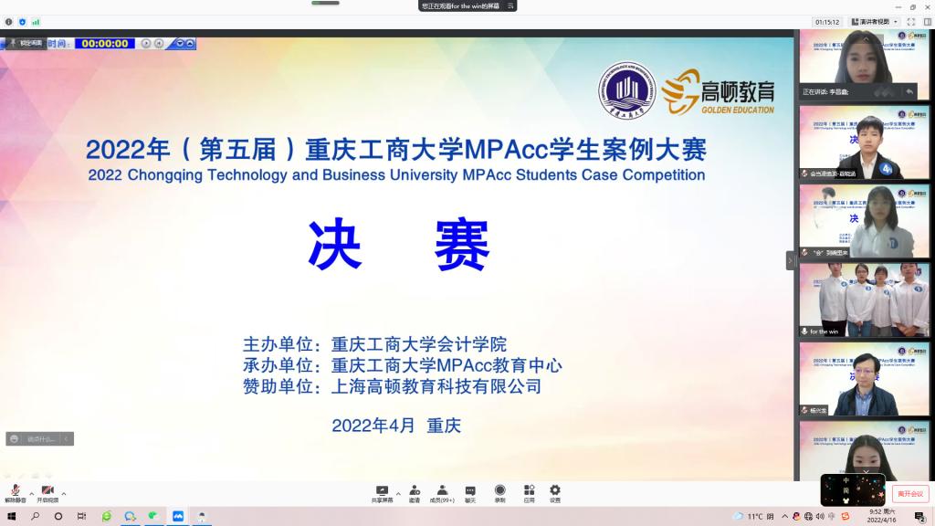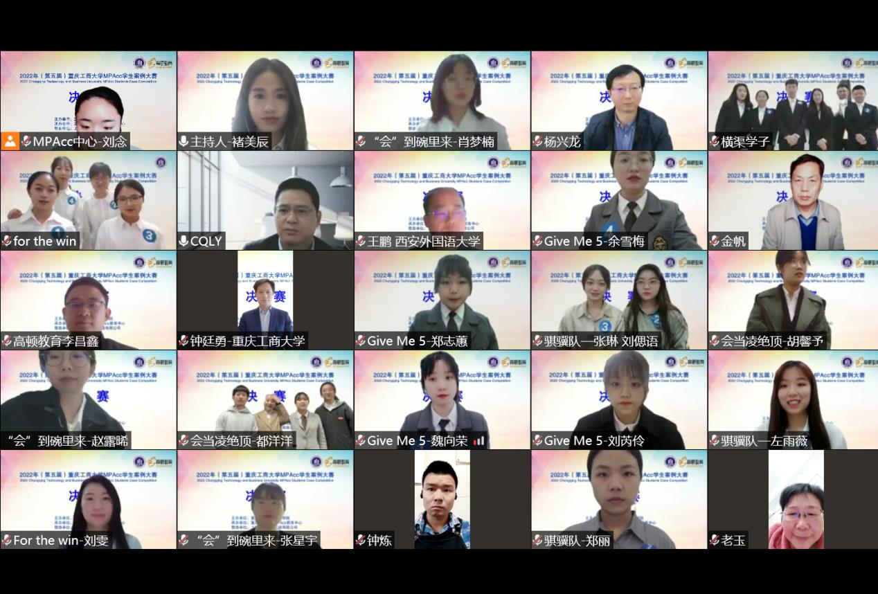 4月16日上午,重庆工商大学第五届MPAcc学生案例大赛决赛以在线会议的形式顺利举行。9428cn太阳集团古天乐分党委书记罗惠玉、院长罗勇、副院长钟廷勇出席会议。大赛邀请了上海高顿教育科技有限公司西部区域负责人李昌鑫先生、西北工业大学管理学院MPAcc教育中心主任金帆教授、西安外国语大学商学院副院长王鹏教授、重庆工商大学李定清教授和杨兴龙副教授担任评委。2021级全体MPAcc学生参与了本次比赛。