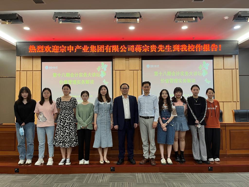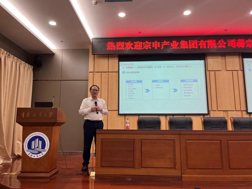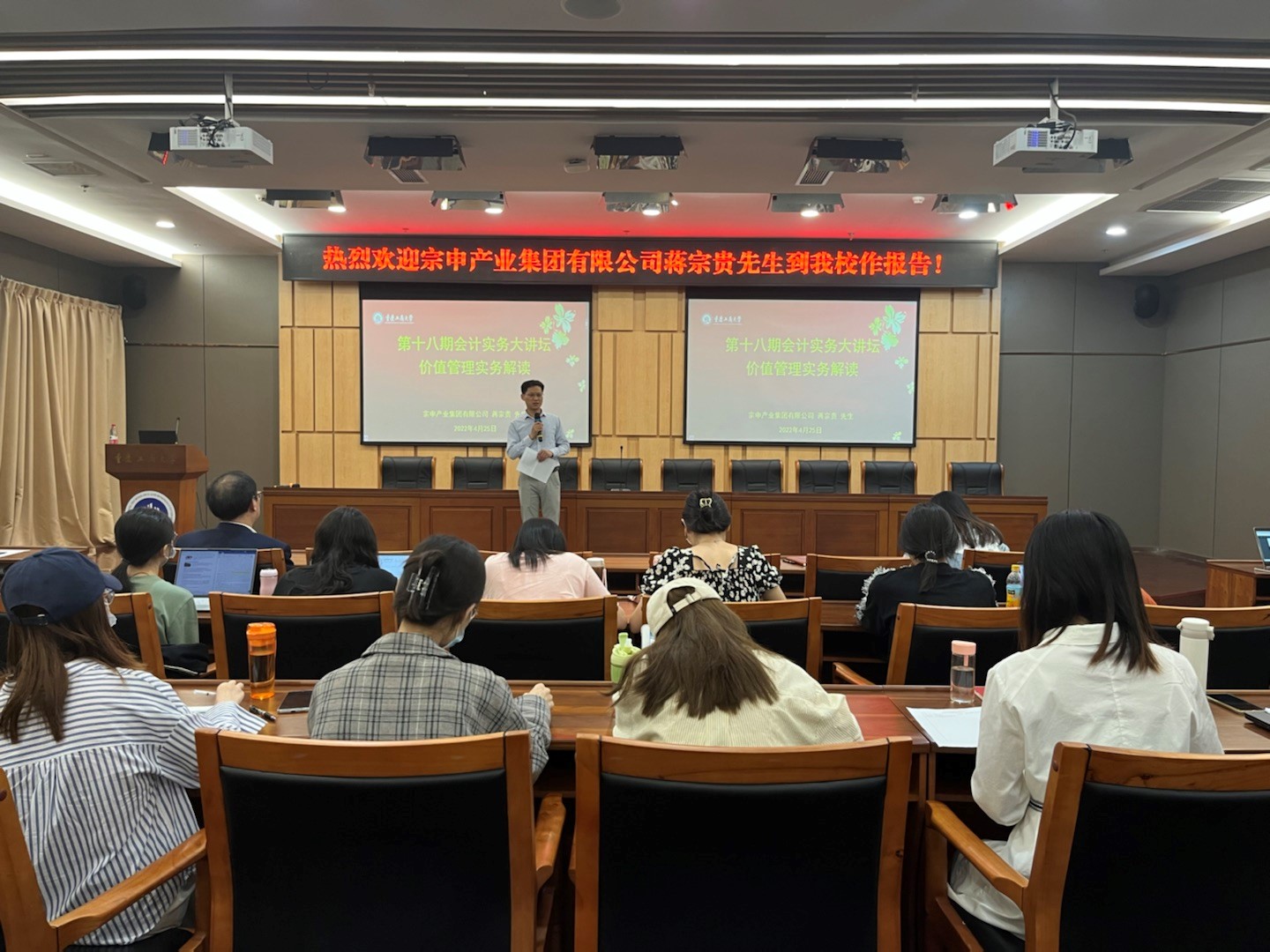 4月25日下午,重庆工商大学9428cn太阳集团古天乐第十八期会计实务大讲坛在图书馆第一会议室顺利举行。宗申产业集团有限公司副总裁蒋宗贵先生应邀为9428cn太阳集团古天乐研究生做《价值管理实务解读》的专题讲座。讲座由重庆工商大学9428cn太阳集团古天乐副院长钟廷勇教授主持。