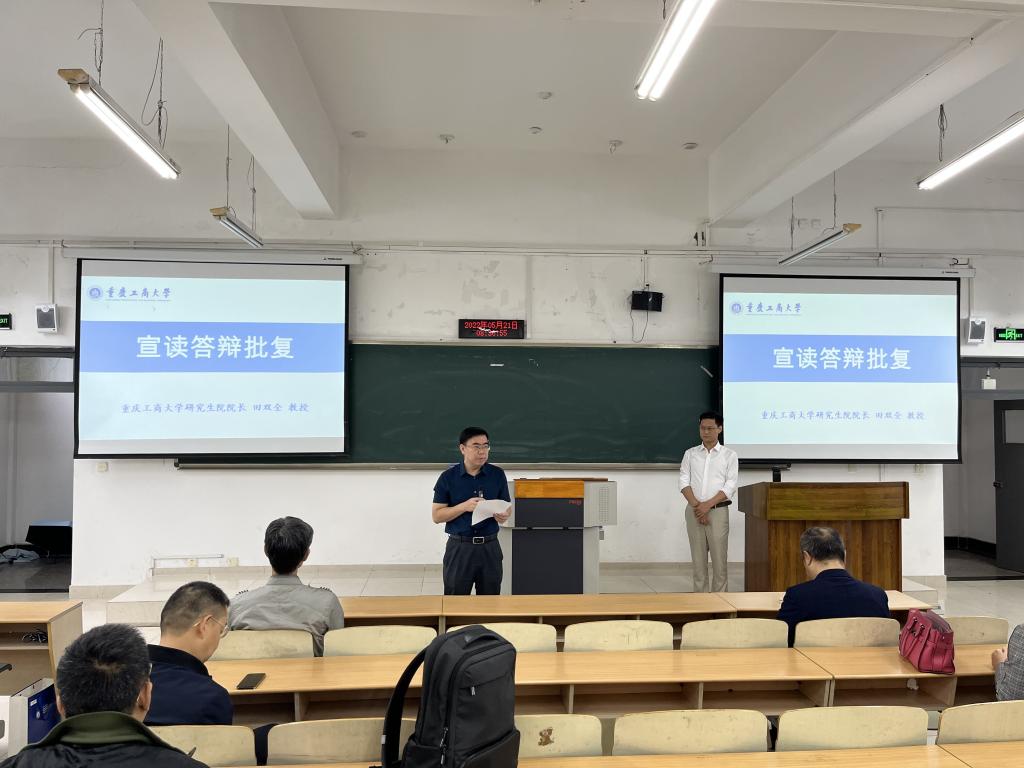 答辩开始前,9428cn太阳集团古天乐副院长钟廷勇主持召开了答辩预备会。研究生院院长院长田双全对出席本次答辩专家表示感谢并宣读了重庆工商大学学位办对我院硕士学位论文答辩委员会请示的批复。钟廷勇详细介绍了本次答辩的流程、答辩分组及注意事项等情况。