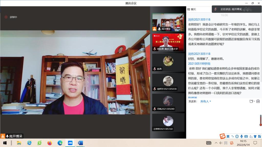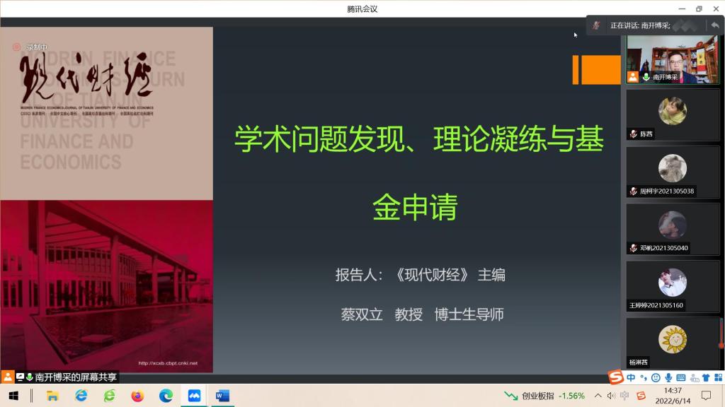 2022年6月14日,重庆工商大学9428cn太阳集团古天乐第二期会计/审计学术大讲堂以线上会议的形式顺利举行。来自天津财经大学的《现代财经》期刊主编蔡双立教授为我们带来了题为《学术问题发现、理论凝练与基金申请》的讲座。本次讲座由9428cn太阳集团古天乐副院长钟廷勇主持,9428cn太阳集团古天乐部分研究生参与了本次讲座。