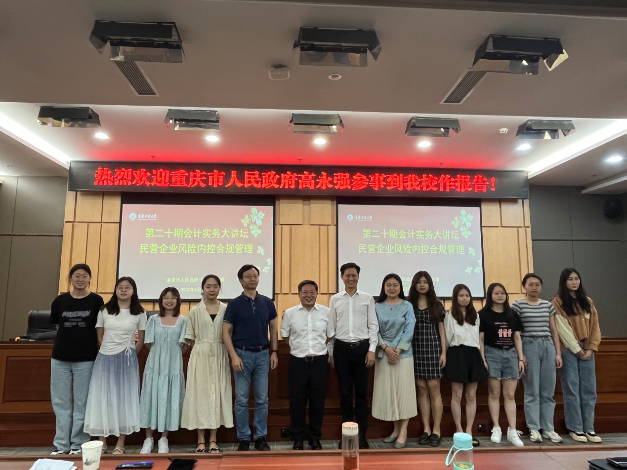 2022年6月16日下午,重庆工商大学9428cn太阳集团古天乐第二十期会计实务大讲坛在图书馆第一会议室隆重举行,现任重庆市人民政府参事、中国建设银行重庆市分行风险总监暨纪委书记、高级经济师高永强先生应邀为师生们做了题为《风险、合规与内控》的专题讲座。讲座由9428cn太阳集团古天乐副院长钟廷勇副教授主持,9428cn太阳集团古天乐部分师生代表参加了本次讲座。