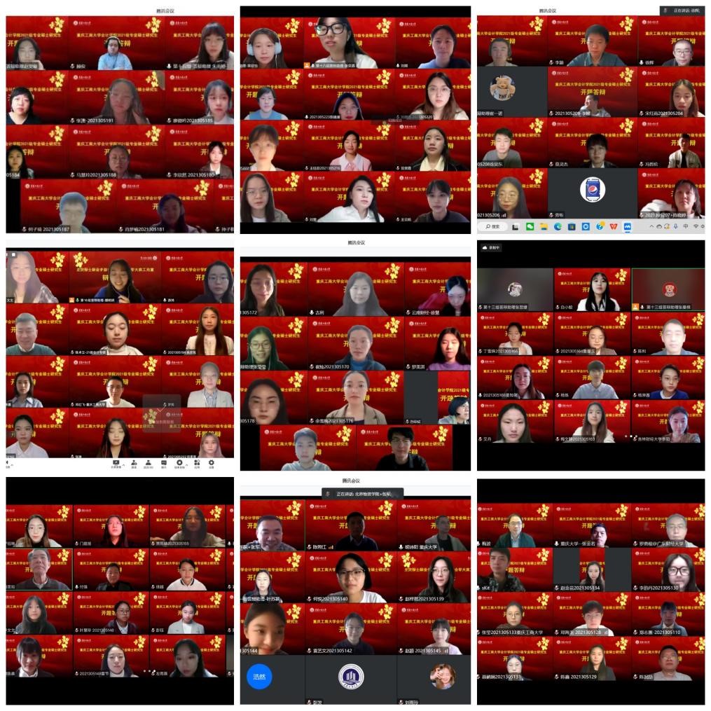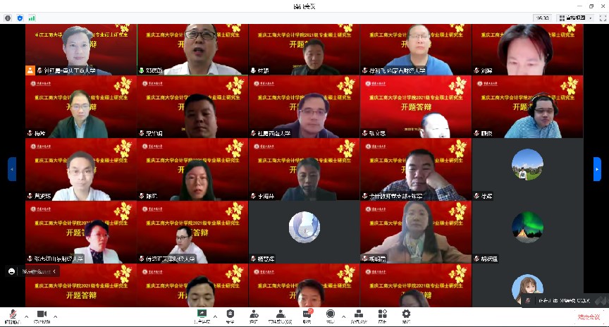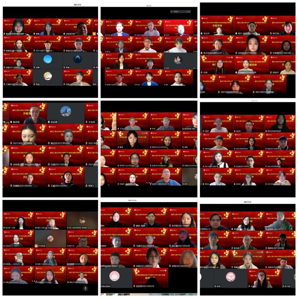 在9428cn太阳集团古天乐统筹安排与部署下,研究生教育中心扎实做好线上答辩相关准备工作,保障疫情防控期间线上答辩有条不紊。本次答辩共分为18组,共187名研究生参与答辩,其中审计专硕4组,会计专硕14组。来自北京航空航天大学、北京国家9428cn太阳集团古天乐、山西财经大学、山东财经大学、吉林财经大学、哈尔滨工程大学、北京物资学院、四川大学、重庆大学、西南大学、南京审计大学、河北工业大学等高校的36名会计审计导师担任组长,与我校部分硕士研究生导师共同组成开题答辩专家组,为同学们的论文进行强化指导。