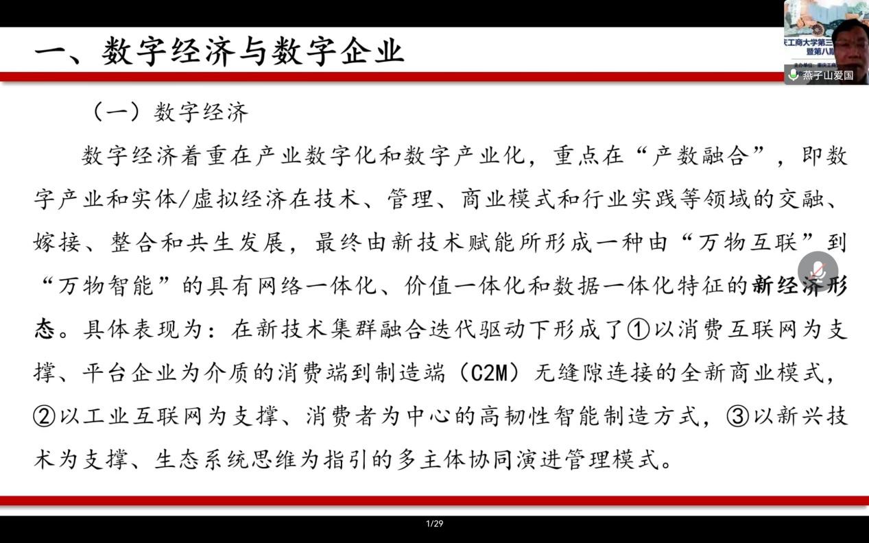 王教授首先介绍了数字经济和数字企业,谈到了数字经济的着重点——产数融合,同时也介绍了数字企业的有关特点以及与企业现代信息系统的区别。其次王教授谈到了智能会计的意义与特征,它拥有大数据分析智能以及辅助决策支持功能,同时智能会计也是一种跨专业、跨领域的交叉学科,具有计算会计科学属性。在谈到智能会计专业建设时,王教授强调了要明确培养目标、拟定培养标准、重构课程体系、优化教学内容、创新培养方式以及重塑质量保障体系。王教授还介绍了智能会计在山东财经大学的具体实践。