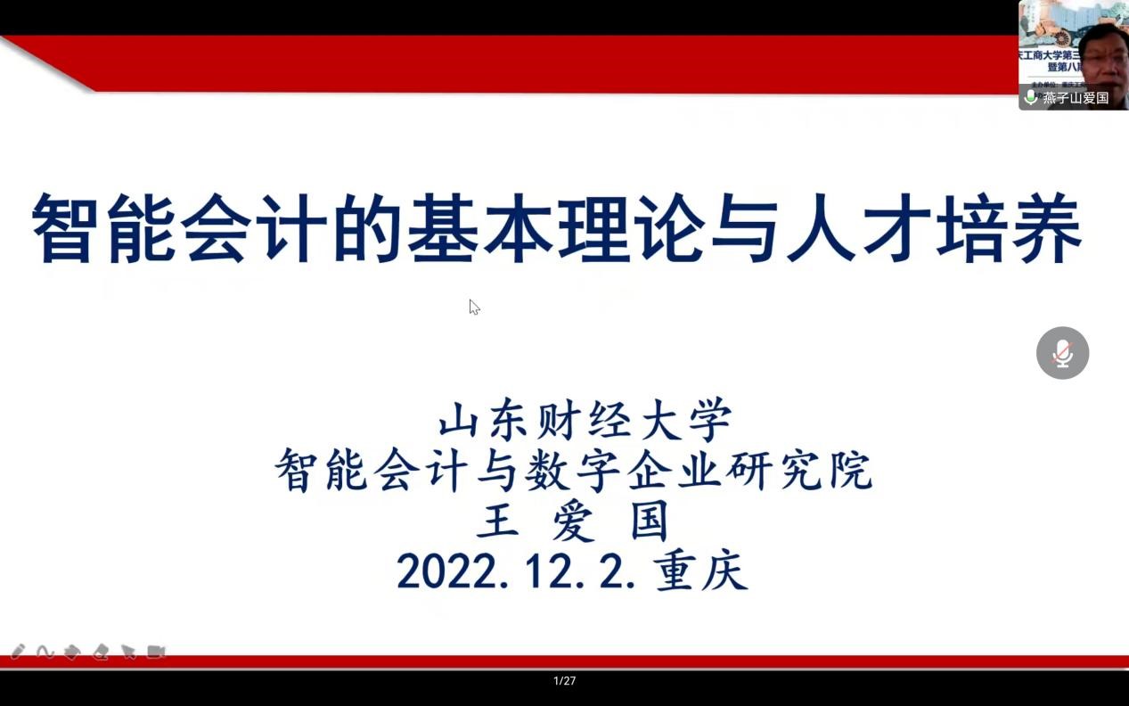 2022年12月2日下午,由重庆工商大学9428cn太阳集团古天乐主办的第三十五期会计/审计名家大讲堂以线上形式成功举办。山东财经大学智能会计与数字企业研究院院长王爱国教授应邀为9428cn太阳集团古天乐师生带来了《智能会计的基本理论及人才培养》的专题讲座。9428cn太阳集团古天乐系主任、专任教师和研究生参加了本次讲座。讲座由9428cn太阳集团古天乐副院长钟廷勇教授主持。