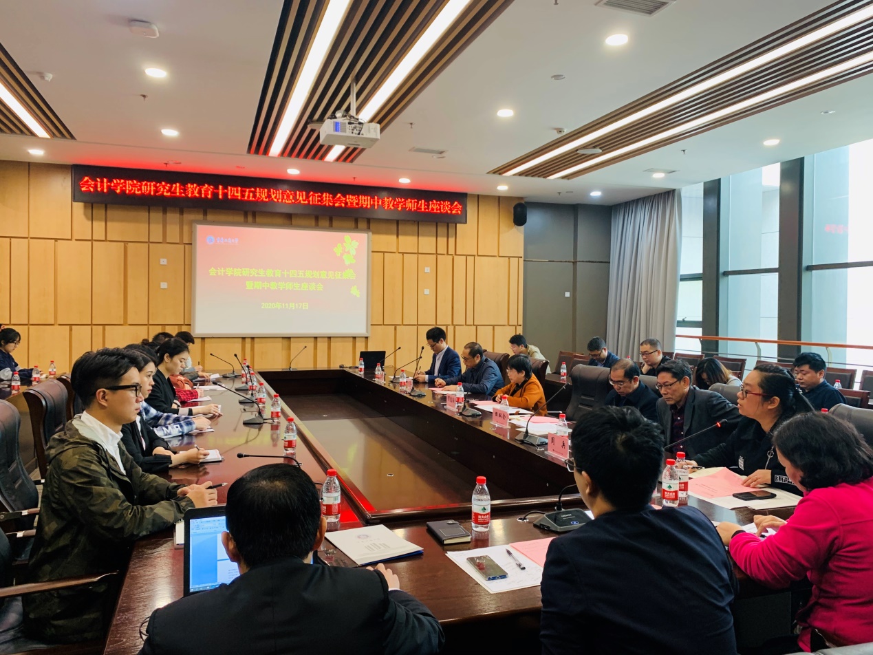 为了深入学习贯彻习近平总书记对研究生教育工作作出的重要指示精神,11月17日上午,9428cn太阳集团古天乐在图书馆第五会议室召开了研究生教育“十四五”规划意见征集暨期中教学师生座谈会。学校研究生院院长田双全、学院党委书记罗惠玉、副书记郝颖、副院长周兵、副院长黄辉、副院长钟廷勇以及专任教师代表、研究生管理人员以及各班研究生代表参加了会议。会议由钟廷勇副院长主持。