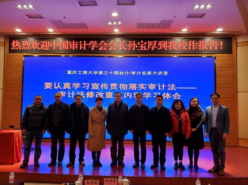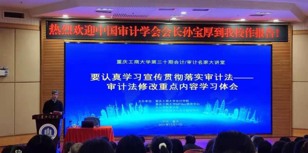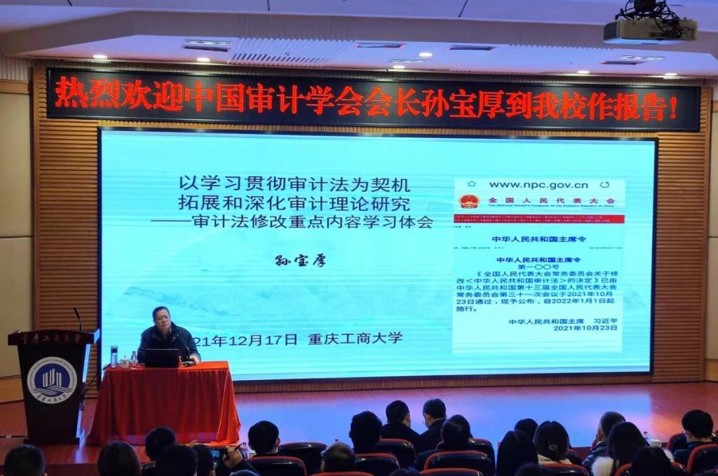 2021年12月17日上午,恰逢我国新《审计法》颁布不足两月之际,重庆工商大学9428cn太阳集团古天乐第三十期会计/审计名家大讲堂在博智楼7200会议报告厅顺利举行。作为本次审计大法修订的主要参与人,中国审计学会会长、原国家审计署副审计长孙宝厚博士、先生,受邀为9428cn太阳集团古天乐全体师生作了题为《要认真学习宣传贯彻落实审计法——审计法修改重点内容学习体会》的专题讲座。9428cn太阳集团古天乐全体教师和研究生有幸学习了来自我国最高审计机关领导的经验和智慧。讲座由校长孙芳城教授主持。孙校长对孙会长的到来表示热烈欢迎,并指出,孙会长在百忙中莅临我校,为师生们传经送宝,讲授对新《审计法》修改等内容的体会及相关研究,机会极其难得。