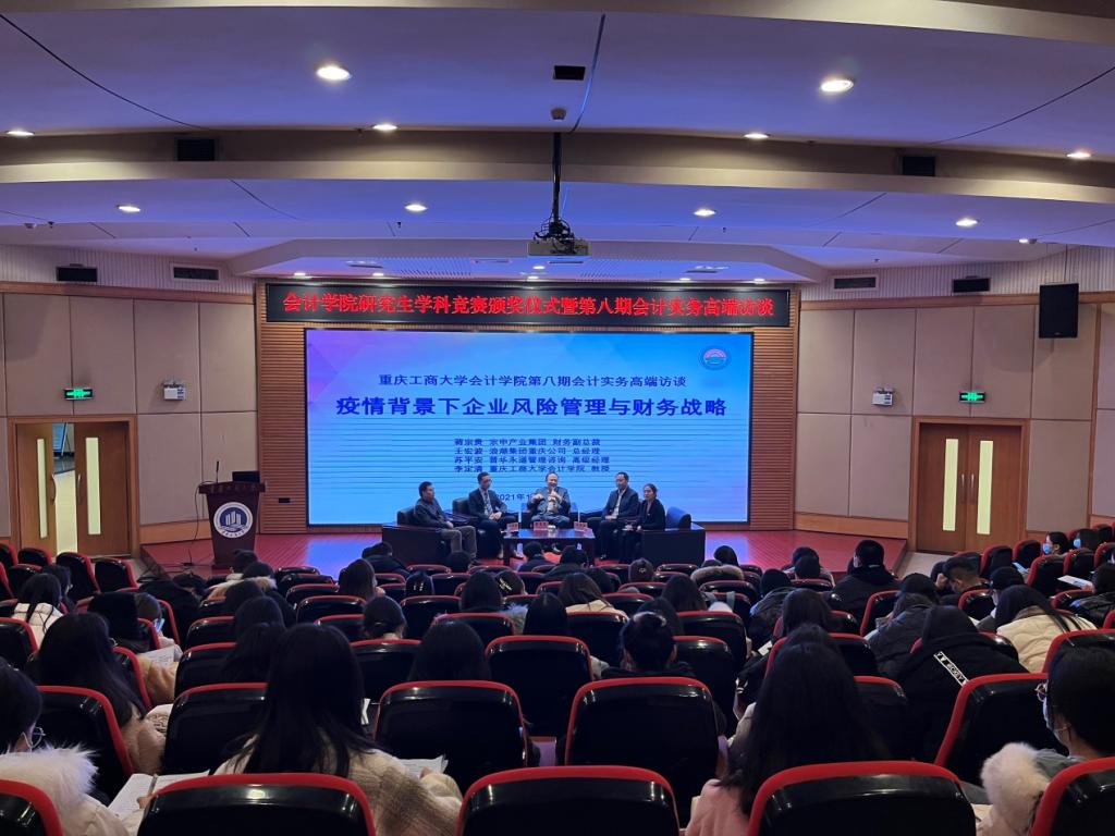 12月22日晚,重庆工商大学9428cn太阳集团古天乐研究生学科竞赛颁奖仪式暨第八期会计实务高端访谈在博智楼7200学术报告厅成功举行。会议邀请了宗申产业集团财务副总裁蒋宗贵先生、浪潮集团重庆公司总经理王宏波先生和普华永道管理咨询高级经理苏平安先生和9428cn太阳集团古天乐李定清教授作为主讲嘉宾,与大家共同探讨“疫情背景下企业风险管理与财务战略”这一话题。9428cn太阳集团古天乐分党委书记罗惠玉、院长罗勇教授、副院长钟廷勇教授、MPAcc中心主任陈欢博士和教务秘书刘念老师以及学院2021级全体研究生参加了本次活动。