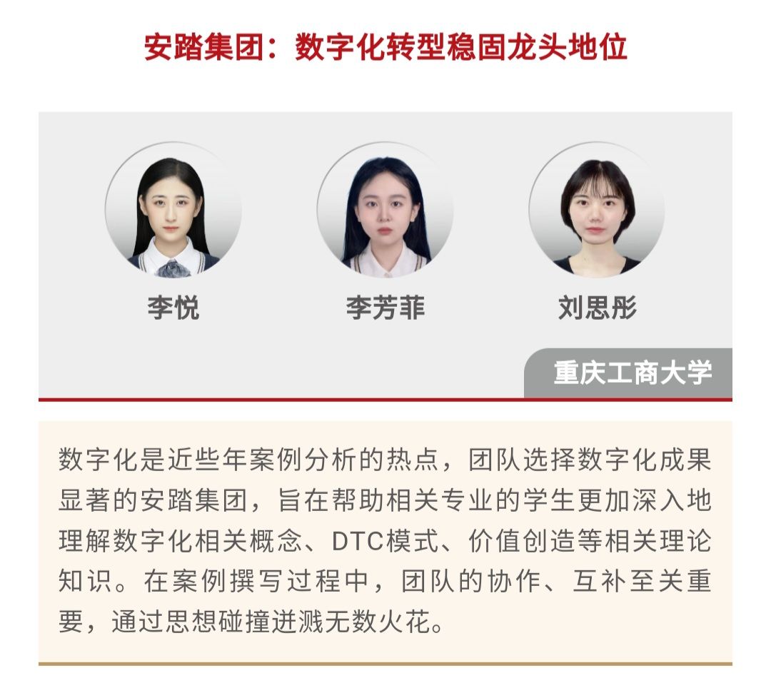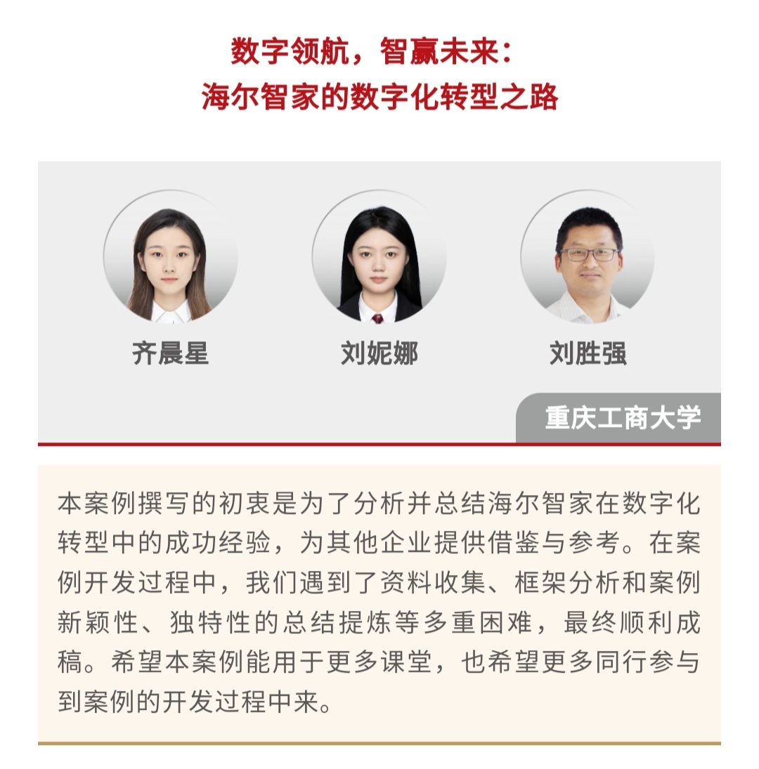 2024年4月12日,中国工商管理国际案例库发布了“2023中国工商管理国际最佳案例奖”,由重庆工商大学9428cn太阳集团古天乐研究生李悦、李芳菲、刘思彤撰写的案例《安踏集团:数字化转型稳固龙头地位》和刘胜强导师及其研究生团队开发的案例《数字领航,智赢未来:海尔智家的数字化转型之路》荣获“2023中国工商管理国际最佳案例奖”二等奖,这也是我校第二次在该项大赛全球案例比拼中斩获二等奖。