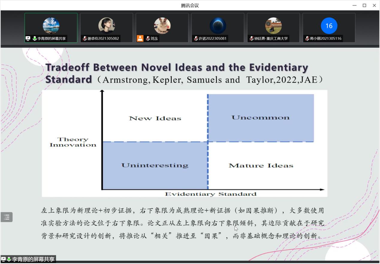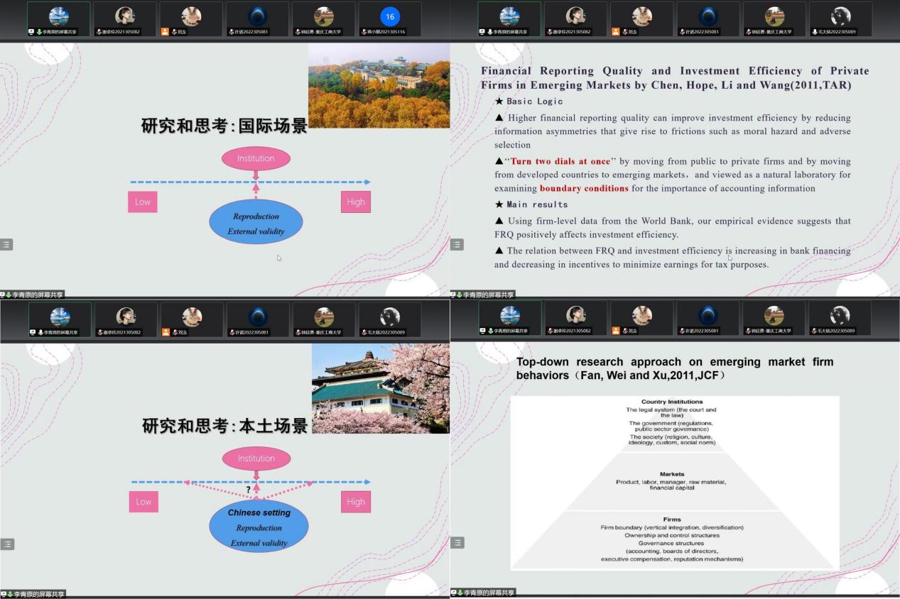 围绕制度与财务会计的研究与思考,李青原教授从国际场景和本土场景两方面进行说明。他表示,大量跨国文献对FRQ与投资效率关系等问题的研究,为会计信息的重要性提供了实证依据。对于这部分研究的复制和外部有效性,国内文献认为应全面展开基于中国国情的财务会计研究,强调政策实验的样本代表性和政府策略性特征将决定其有效性和准确性。同时,李青原教授还推荐同学们阅读与我国制度改革相关的重要文献,明晰改革的价值所在。