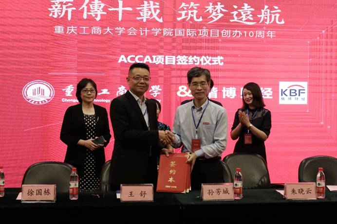 (签约仪式:重庆工商大学校长孙芳城与楷博财经总裁王舒)