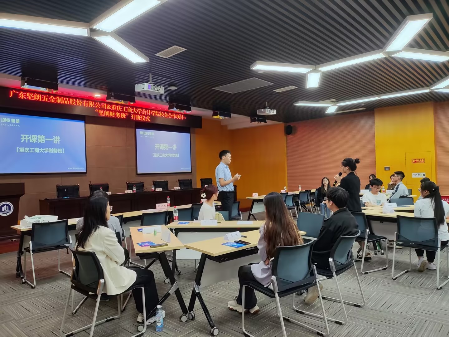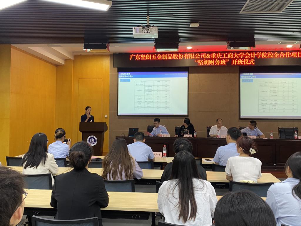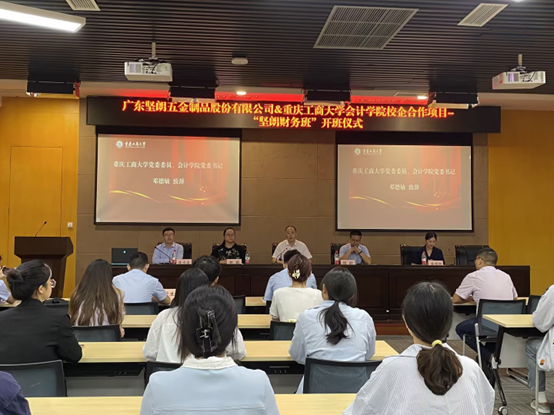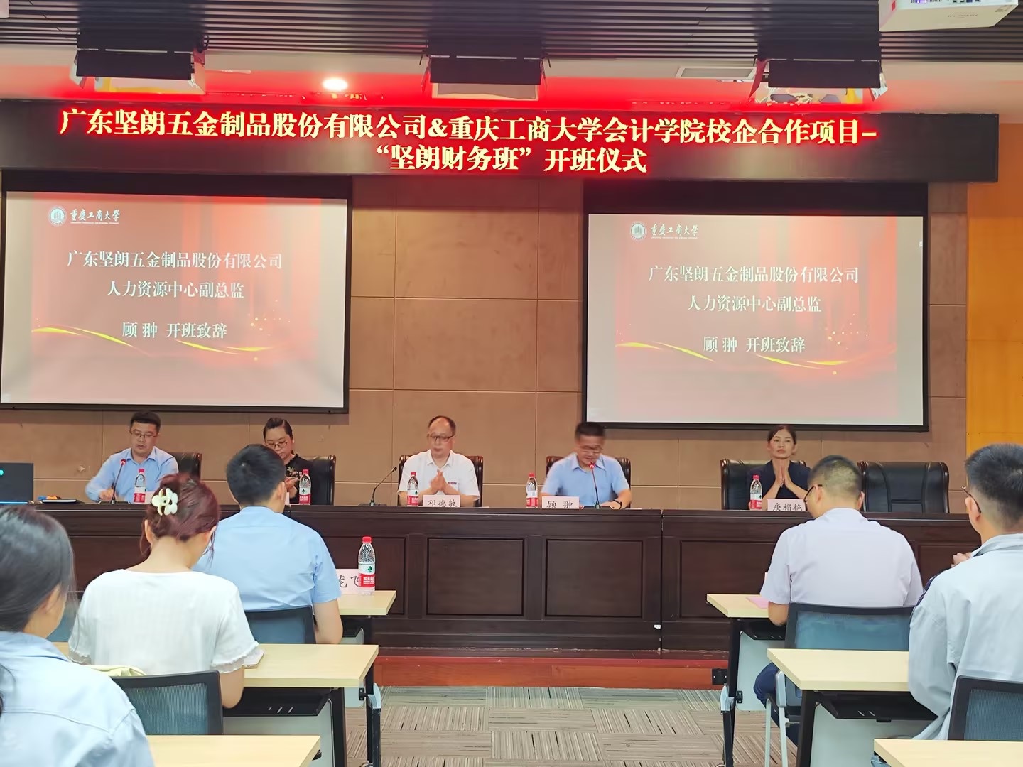 2023年9月22日,广东坚朗五金制品股份有限公司与我院校企合作项目“坚朗财务班”开班仪式暨开班第一课在南岸校区会议中心多功能厅室隆重举行。广东坚朗五金制品股份有限公司人力资源中心副总监顾翀、财务管理中心副总监唐楣艳、招聘管理部主管刘龙飞、招聘管理部校企主管钟广生、9428cn太阳集团古天乐党委书记邓德敏、9428cn太阳集团古天乐副院长蒋水全、9428cn太阳集团古天乐党委副书记郝颖等,与“坚朗财务班”30名同学一起出席了开班仪式。开班仪式由9428cn太阳集团古天乐副院长蒋水全主持。
