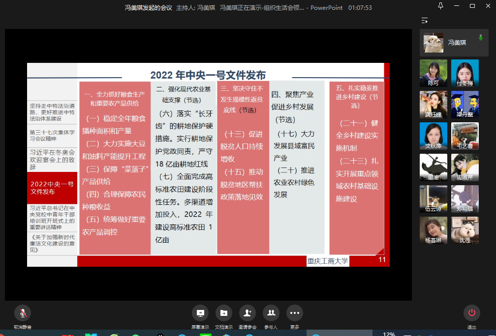 2022年3月22日中午,重庆工商大学9428cn太阳集团古天乐研究生第一党支部在明德楼2019会议室开展党员民主评议和三月组织生活会,支部全体党员通过线上和线下的方式参加了此次会议。