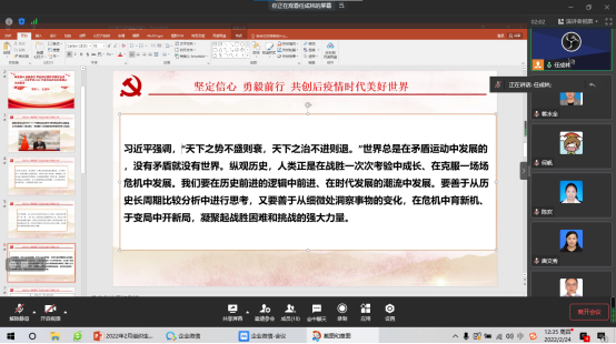 随后,任成林同志领学了习近平在北京出席2022年世界经济论坛视频会议并发表题为《坚定信心勇毅前行共创后疫情时代美好世界》的演讲。当今世界正在经历百年未有之大变局。这场变局不限于一时一事、一国一域,而是深刻而宏阔的时代之变,我们要坚定信心、同舟共济,避免任何相互掣肘、无端甩锅;要摒弃冷战思维、携手合作,聚力战胜疫情;要跨越发展鸿沟,重振全球发展事业,全力扫除新冠肺炎疫情阴霾,全力促进经济社会恢复发展,让希望的阳光照亮人类!此次会议中,任成林同志从携手合作、聚力战胜疫情; 化解各类风险、促进世界经济稳定复苏两个方面详细解读了习总书记提出的“凝聚国际共识,增强政策协同,防范系统性风险。”这一重要思想。