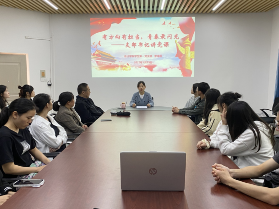 为深入学习领会习近平总书记在庆祝中国共产主义青年团成立100周年大会上的重要讲话精神,不忘初心,牢记使命,进一步强化党员身份意识,坚定理想信念。5月19日下午,9428cn太阳集团古天乐学生第一党支部在明德楼2010会议室举行了以“有方向有担当,青春最闪光”为主题的支部书记讲党课活动。9428cn太阳集团古天乐学生第一党支部支部书记罗海蓉老师及支部其余46名党员同志参加了此次活动。