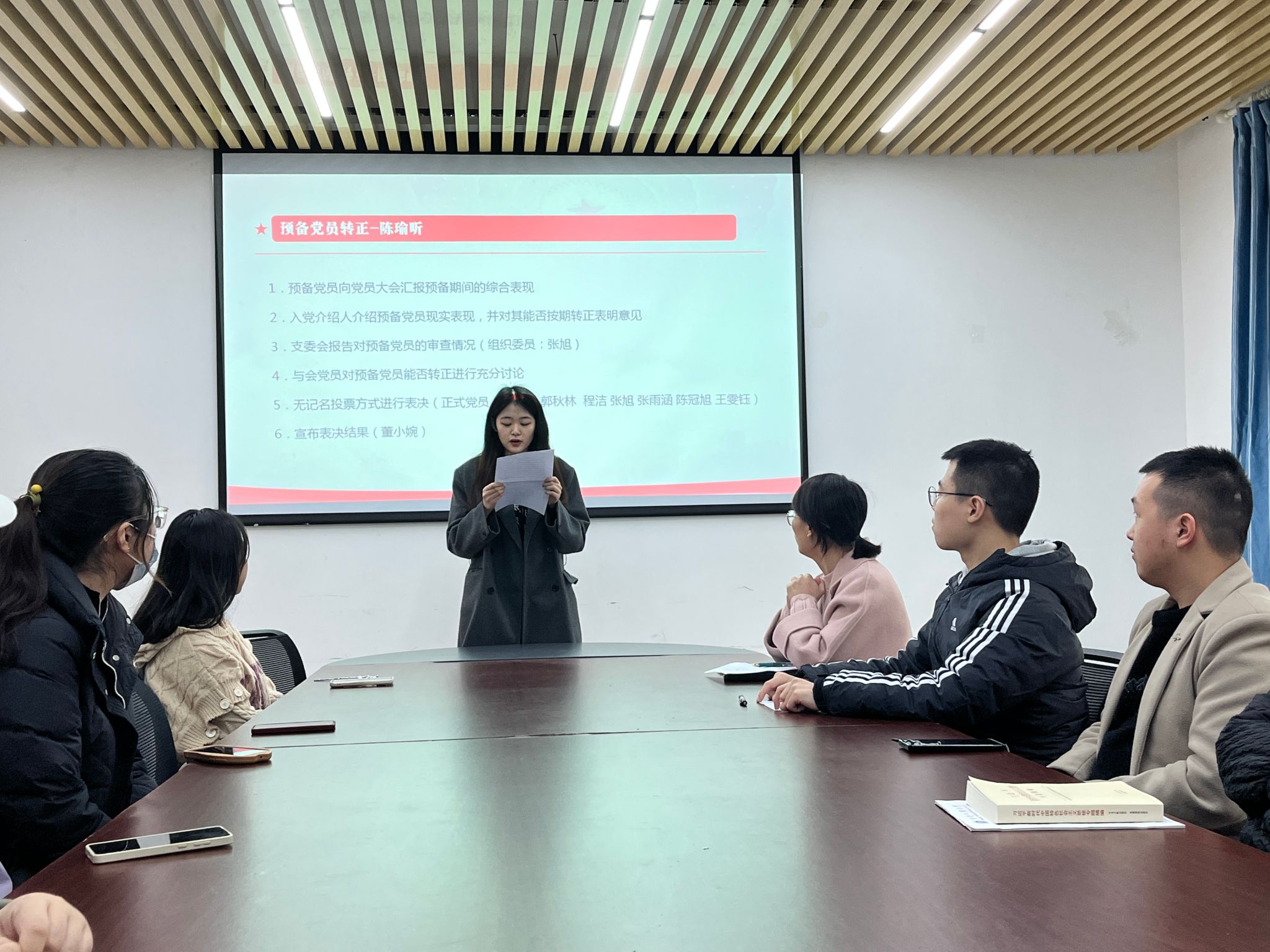 最后,支部围绕预备期满的党员同志召开了预备期满党员转正大会,会上预备期满的陈瑜昕同志汇报了预备期间的综合表现,入党介绍人介绍了其现实表现,并对其按期转正发表肯定意见。支委会通过考察陈瑜昕同志预备期的工作表现、政治审查以及谈话教育等方面的表现,认为该同志符合正式党员的标准,同意其按期转正。与会正式党员对陈瑜昕同志能否转正进行讨论和无记名投票。支部书记董小婉同志宣布表决结果,经与会党员的讨论和无记名投票方式表决,具有表决权的7名党员一致同意陈瑜昕同志按期转正。