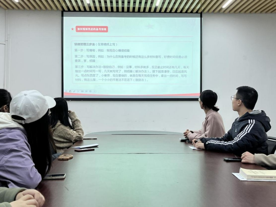 “交流直通车”板块,南阳同志结合考研、期末临近的实际情况向大家分享了备考情绪管理经验,她介绍了情绪管理三步法:第一步写情绪、第二步写原因、第三步写解决方法+鼓励自己。同时,她认为适度的睡眠、运动、娱乐有助于维持身体的激素水平平衡,保持神经系统正常工作,以达到良好的备考情绪管理。支部党员同志针对这一话题积极分享了自己的备考情绪管理小技巧。