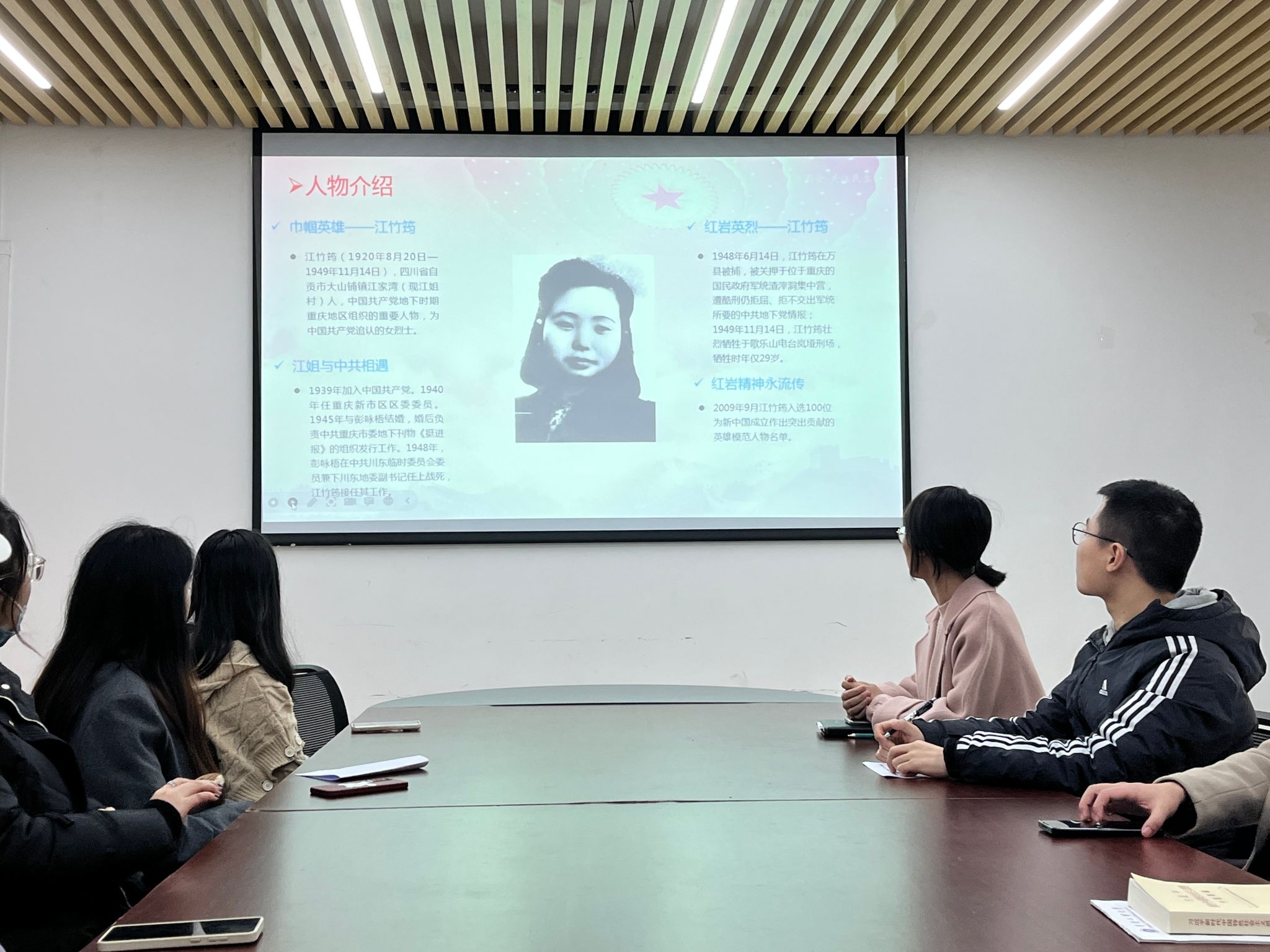 “红岩小讲坛”板块,刘美玲同志介绍了革命历史见证之地渣滓洞,以及巾帼英雄江竹筠的先进事迹,展示了革命先烈把生死置之度外,为民族解放和共产主义事业献身的初心;不畏艰难险阻,进行韧性战斗,坚守革命阵地的使命;以无产阶级的博大胸怀团结一切可以团结的力量,最大限度地孤立顽固派和反动势力的决心;深入社会,扎根群众,永远保持为人民服务的本色,始终保持同人民群众的血肉联系的担当。支部全体党员同志表示在今后的学习工作生活中,不忘初心、牢记使命,为中华民族伟大复兴艰苦奋斗、锤炼意志。