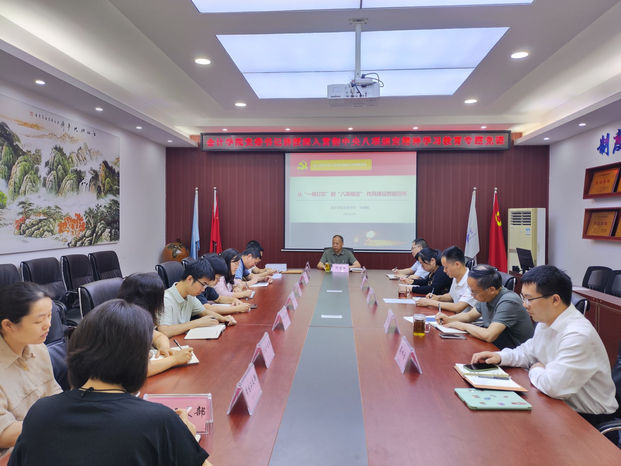 为扎实开展深入贯彻中央八项规定精神学习教育,持续深化作风建设,6月4日上午,9428cn太阳集团古天乐党委在明德楼2019举行深入贯彻中央八项规定精神学习教育专题党课,学院党委书记邓德敏以《从“一根灯芯”到“八项规定” 作风建设跨越百年》为主题,为大家讲专题党课,学院领导班子、全体党支部书记参加了此次党课学习。