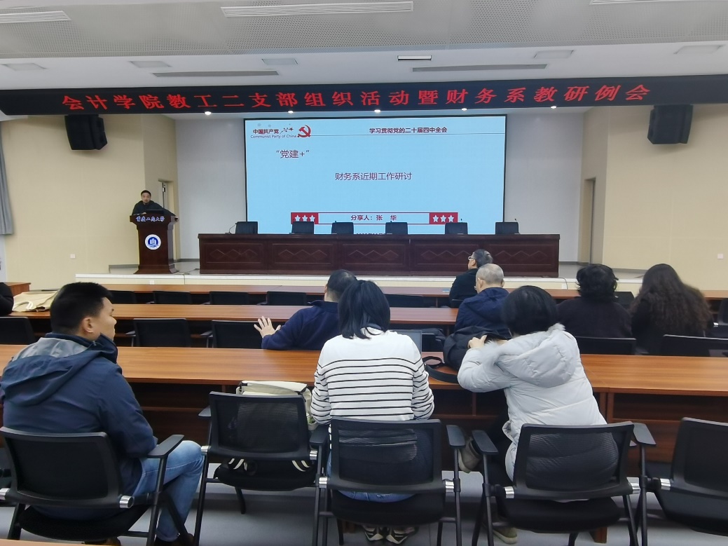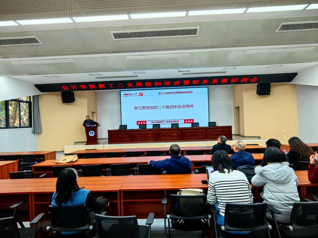 为深入学习贯彻党的二十届四中全会精神,推动党建工作与教育教学工作深度融合,2025年11月27日,重庆工商大学9428cn太阳集团古天乐教工二支部组织生活暨财务系教研例会顺利开展。会议以“深学细悟全会精神,聚力课程改革创新”为主题,通过专题学习与集体研讨相结合的形式,切实把思想和行动统一到党中央决策部署上来,为下学期课程建设与教学质量提升明确方向。