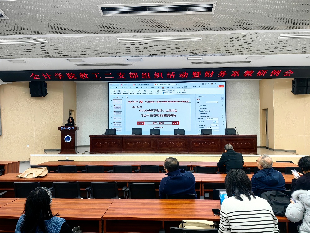 会议伊始,唐文秀同志带领全体教师集中学习“中共中央召开党外人士座谈会习近平主持并发表重要讲话”精神。她围绕讲话中关于凝聚共识、汇聚力量的核心要义,结合高校教育工作实际,强调要坚持党的全面领导,在教学科研中践行“立德树人”根本任务,主动对接国家战略需求,培养符合新时代要求的财经类人才。
