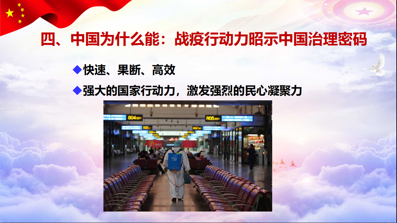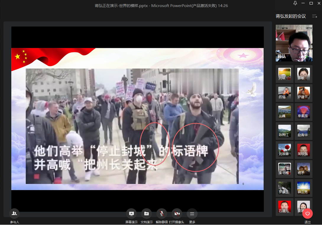 6月24日,9428cn太阳集团古天乐教工一支部通过企业微信视频会议召开了“一堂微党课:中国为什么能?”主题党日活动,本次活动围绕习近平总书记关于疫情防控重要讲话和指示批示精神,充分运用数据和事例,以生动的话语向党员同志讲述了在抗疫过程中我国的制度优势以及中国共产党牢记人民利益高于一切的责任担当。会议由支部书记蒋弘主持,蒋弘和宣传委员秦冬梅在微党课上分别分享了他们所搜集和整理的相关内容,与党员同志共勉。
