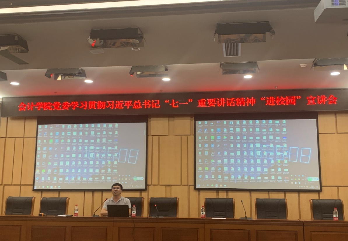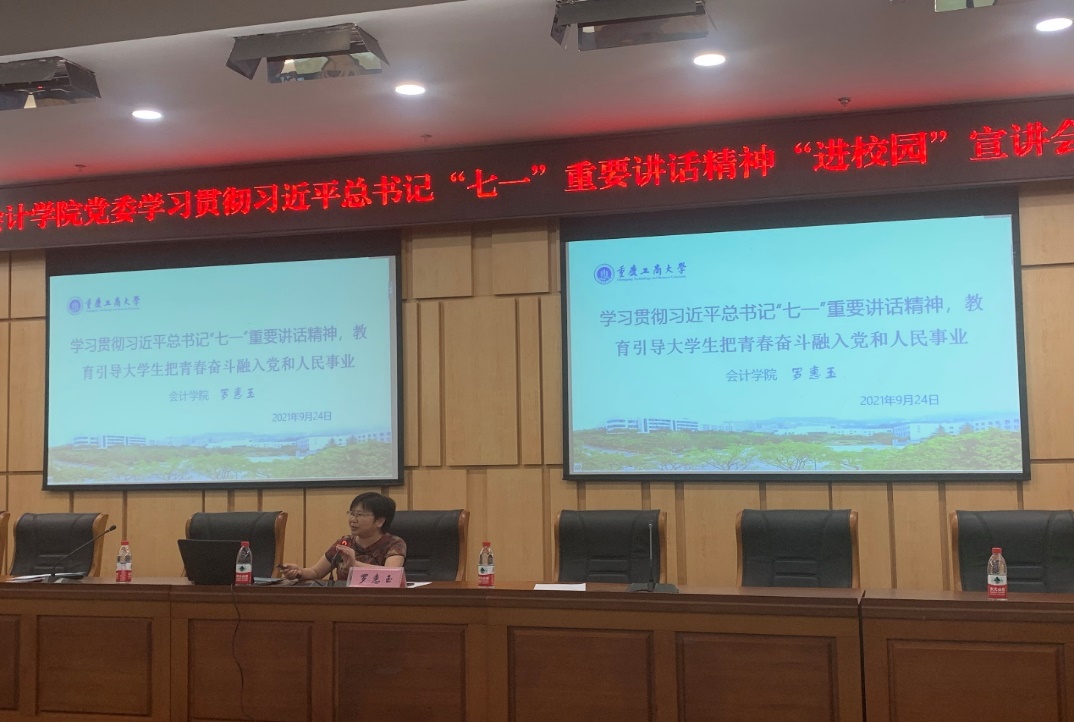 为了学习贯彻习近平总书记在庆祝中国共产党成立100周年大会上的重要讲话精神,激励学院凝心聚力推动学院高质量发展,9月24日下午,9428cn太阳集团古天乐党委在图书馆一号会议室面向全体党员教师开展了学习贯彻习近平总书记“七一”重要讲话精神“进校园”宣讲活动,专题党课分别由9428cn太阳集团古天乐党委书记罗惠玉、专职组织员石世明作学习分享。