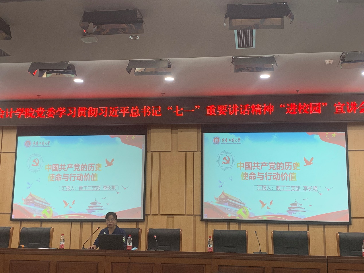 教工三支部李长艳同志以“中国共产党的历史使命与行动价值“为题,深入讲解了中国共产党“全心全意为人民服务、为实现理想不懈奋斗、为人类和平与发展贡献力量”这三个历史使命,简要介绍了中国共产党的百年奋斗历程,深刻阐释党的治国理政理念、实践和成就,深入阐明了中国共产党从哪里来、向何处去的问题,从5个方面回答了中国共产党是一个什么样的政党等问题。