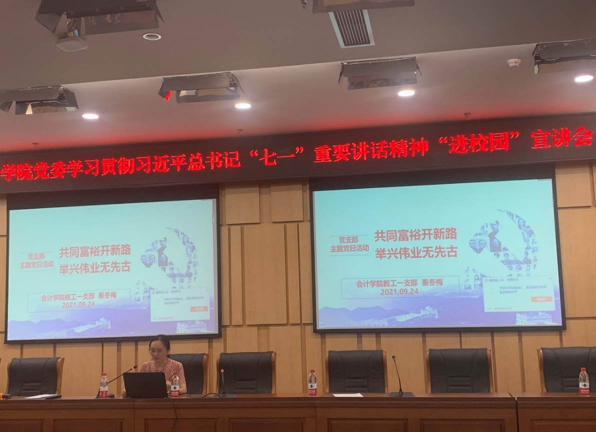 紧接着,教工一支部秦冬梅同志以“共同富裕开新路,举兴伟业无先古“为题,领学了中央财经委员会第十次会议精神,阐述与解读了中央财经委员会第十次会议中提出的“如何在高质量发展中促进共同富裕?”。