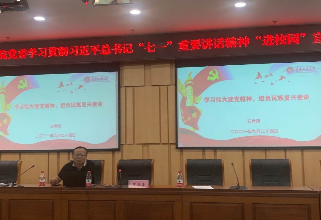 随后,9428cn太阳集团古天乐专职组织员石世明同志作了题为“学习伟大建党精神,担负民族复兴使命“的主题报告。一百年前,中国共产党的先驱们创建了中国共产党,形成了坚持真理、坚守理想,践行初心、担当使命,不怕牺牲、英勇斗争,对党忠诚、不负人民的伟大建党精神,这是中国共产党的精神之源。石世明同志从伟大建党精神形成的基础和条件、伟大建党精神的深刻内涵、中国共产党人精神谱系等角度对伟大建党精神进行深入讲解。随后,站在高等教育工作者的角度,他指出:“立德树人,培养民族复兴大任的时代新人”是高校教师的使命,我们要坚持铸魂育人,全面落实立德树人的根本任务,落实”三全育人,做好课程思政和思政课程“同向发力”。此外,石世明同志还领学了《第27次全国高校党建会议精神》和《重庆市高校党的建设工作会议》两个重要文件。