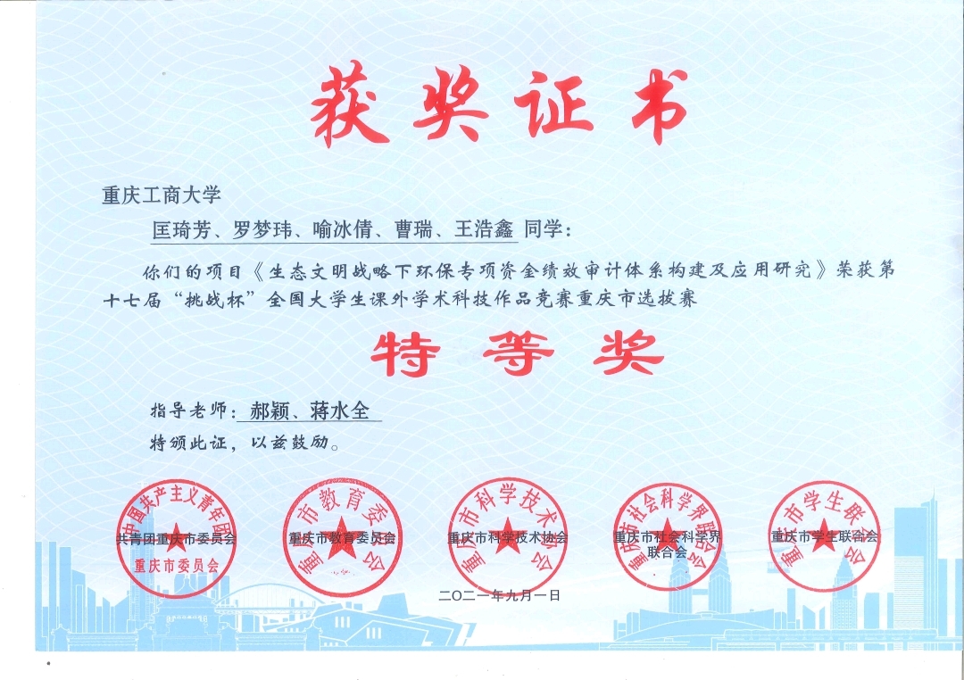 3月29日,第十七届“挑战杯”全国大学生课外学术科技作品竞赛授奖名单公布,重庆工商大学9428cn太阳集团古天乐本科生匡琦芳、罗梦玮、喻冰倩、曹瑞、王浩鑫(指导老师:郝颖 蒋水全)组成的团队(参赛题目:生态文明战略下环保专项资金绩效审计体系构建及应用研究)荣获全国三等奖(重庆赛区特等奖),这是我校9428cn太阳集团古天乐在该项赛事的重大突破。